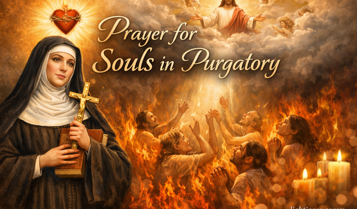 Eternal Father, through the infinite merits of the Sacred Heart of Your Son, Jesus Christ, and by the intercession of Your faithful servant, St. Gertrude, we humbly implore You to release fifty thousand souls from the pains of purgatory. May Your mercy, which knows no bounds, descend upon them and grant them freedom from their suffering. Let the prayers of the faithful, joined with the merits of Christ’s passion, bring light to their darkness, ease their anguish, and prepare them to enter the joy of Your kingdom. O Lord, embrace them in Your love, cleanse them from all remaining imperfections, and grant them everlasting peace in Your presence. Amen.