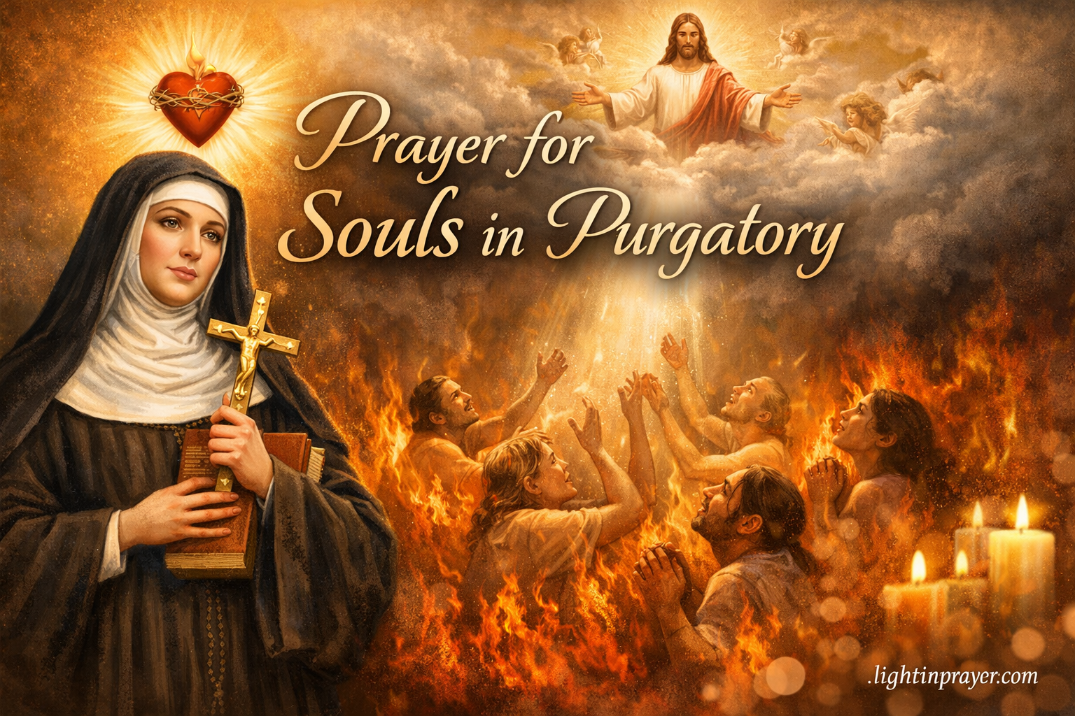 O Eternal Father, in the boundless mercy of Your heart, we lift up the souls of those who are undergoing purification. Through the intercession of Your faithful servant, grant them relief and peace. May the blood of Your beloved Son, Jesus Christ, cover all their sins and sanctify their souls, purifying them completely. Let their suffering be lightened, their waiting fulfilled, and their joy in Your presence eternal. By Your mercy, we ask that they may soon join the assembly of the saints in Heaven, singing forever Your praises. We entrust this prayer to You, O Lord, confident that nothing in Your creation escapes Your love and care. Through Christ our Lord, Amen.